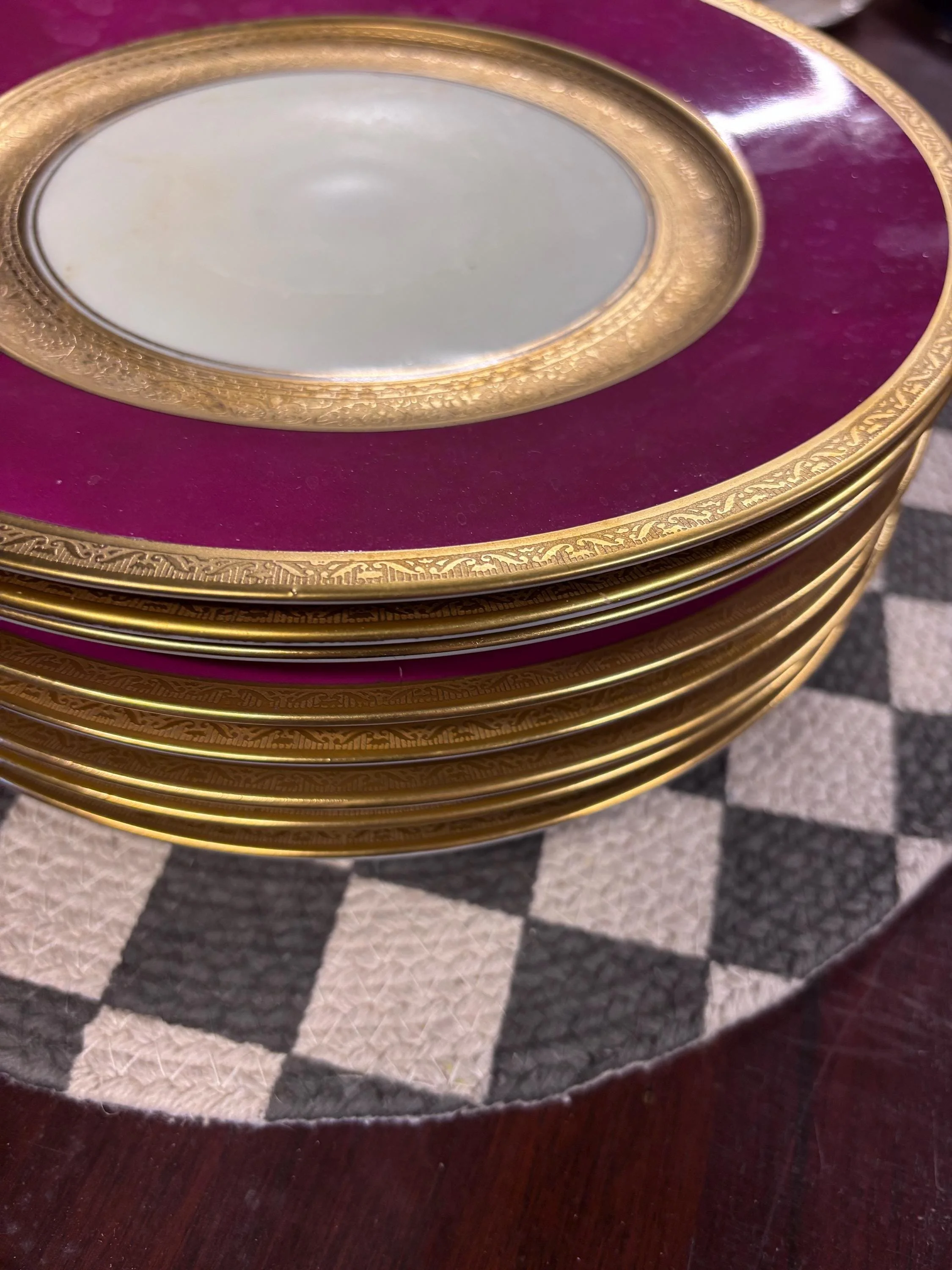 Phenomenal dinner plates in a deep fuscia or hot pink/cerise with plenty of gold for next level glamour! Probably Selb but not marked. Great vintage condition. Approx 10.5 inches. This is a set of eight.