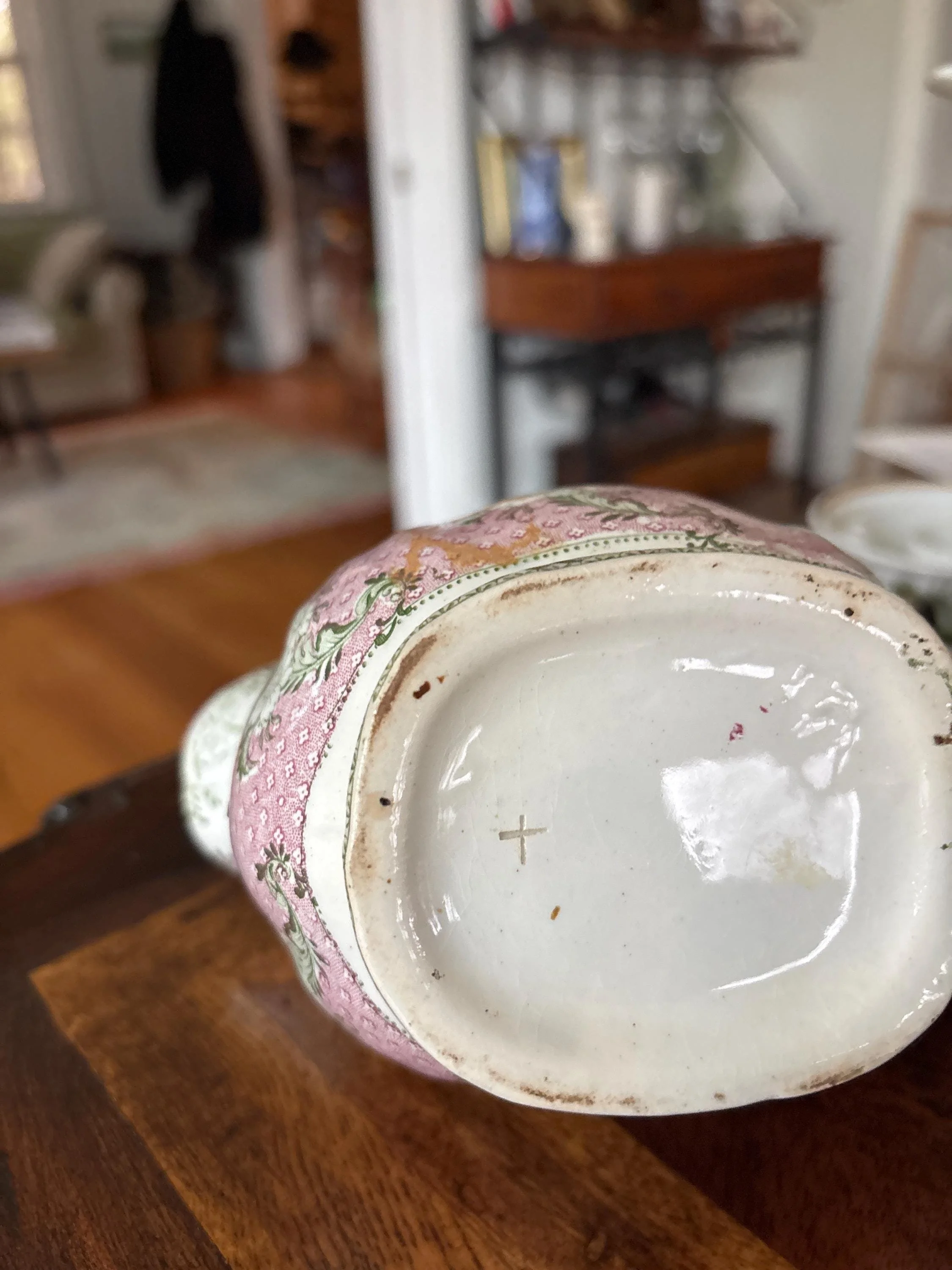 This small pitcher or sauce pitcher is darling. It's only about 6 inches wide, and 4 inches tall, but it is elegant and in excellent condition. Unmarked and possibly rare - I have not seen this shape and color pattern.